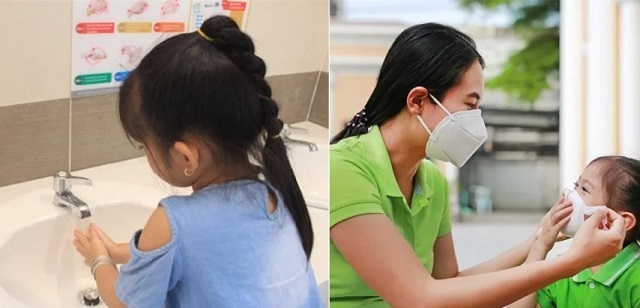 - Điều chỉnh nghiêm ngặt việc rửa tay: Thúc giục trẻ rửa tay, rửa mặt thường xuyên và hạn chế đưa tay chạm mặt. Không cho trẻ mút tay, ngoáy mũi, dụi mắt, bảo trẻ không chạm vào bề mặt đồ vật ở khu vực công cộng (đặc biệt là các bề mặt thường xuyên được chạm vào như nút thang máy). Rửa tay trước khi ăn, sau khi đi tiểu và sau khi chạm vào những đồ vật không sạch sẽ. Dạy trẻ rửa tay theo bảy bước.