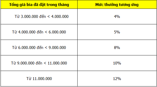CTV được chiết khấu 30% giá bìa trên mỗi đơn đặt hàng. Nếu CTV trong một tháng có lượng đặt hàng tốt sẽ được thưởng trên tổng giá bìa đã đặt trong tháng như sau: