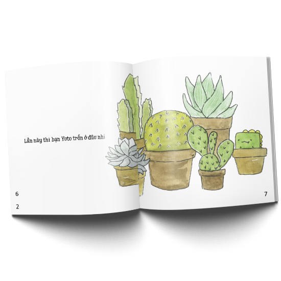 Các bé biết không, trong câu chuyện “Khủng Long đi đâu rồi nhỉ”, bạn Khủng Long có cái tên Yuto không hề khổng lồ đâu, mà Yuto bé xíu, xanh tươi và đeo cả chiếc bờm vàng nữa. Khủng Long Yuto thích đi lang thang chơi trò trốn tìm cùng các bạn nhỏ, làm sao để các bé thật khó để tìm ra. Đầu tiên, Yuto hòa vào những chiếc hộp màu sắc, không biết có bạn nhỏ nào nhìn thấy bạn ý ở đây không nhỉ? Bạn Yuto có giống như một cây xương rồng không, khi mà bạn ấy trèo vào một chiếc chậu cây và hòa vào khu vườn đầy xương rồng. Yuto nghịch ngợm chui vào ngôi nhà giống như của các bạn mèo, bạn chó hay bạn vịt con nữa, trông hệt như một bạn thú cưng vậy. Bạn Khủng Long Yuto còn có thể biến hóa mình thành chiếc khinh khí cầu đầy màu sắc để thả mình khám phá bầu trời. Có lúc, bạn ấy trở thành hộp quà giáng sinh thắt chiếc nơ trên đầu cũng rất khó nhận biết. Nhiều lúc, Yuto biến thành đồ ăn, là chiếc bánh cupcake ngọt ngào hay cả miếng sushi thơm ngon nữa, các bé sẽ khó nhận ra lắm đấy. Nếu ở trên chiếc túi xách, Yuto sẽ trở thành chiếc huy hiệu nhỏ xinh điểm tô thêm cho món đồ thêm bắt mắt. Cuối cùng, kết thú một vòng thám hiểm, bạn Khủng Long Yuto quyết định không trốn nữa, xuất hiện để tiếp tục nghĩ ra các trò chơi mới với các bạn nhỏ.