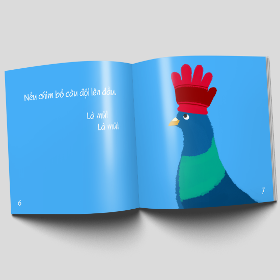 Đầu tiên là chiếc găng tay. Chiếc găng tay có năm ngón, khi chim bồ câu đội lên đầu thì giống một chiếc mũ. Bạn hươu cao cổ có cặp sừng đáng yêu, và nếu bạn ấy muốn đội mũ lên đầu thì có lẽ phải chọn cho bạn ấy đôi tất xinh xắn thì mới vừa với cặp sừng đó. Chiếc váy xòe đội lên đầu của bạn sư tử thì cũng hệt như chiếc mũ xinh. Đố các bé biết, thỏ con với đôi tài dài sẽ đội mũ như thế nào nhỉ? Chiếc quần dài sẽ là một là một lựa chọn phù hợp cho thỏ đấy.