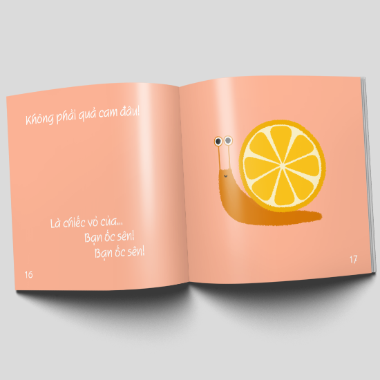 Quả cam với mình tròn không chỉ cho bé nghĩ ngay đến những cốc nước cam mát lành mà còn là ngôi nhà của bạn ốc sên. Ốc sên đi đâu cũng mang theo ngôi nhà hình quả cam này, nên bạn ấy chẳng hề sợ mưa nắng. Bạn ốc sên thật chăm chỉ đúng không nào?