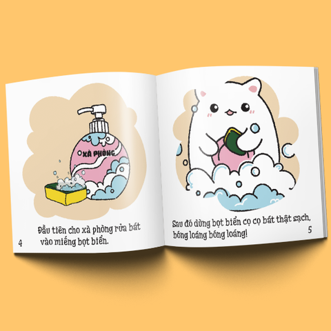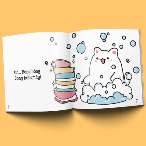 Maru tập rửa bát giống việc mẹ vẫn hay làm hằng ngày, nhưng chắc mẹ không biết rằng bạn ấy đã phát hiện ra rằng rửa bát thực ra là một công việc rất thú vị, khiến cho chú bé Maru có được nhiều niềm vui và trải nghiệm bổ ích đến thế đâu nhỉ.