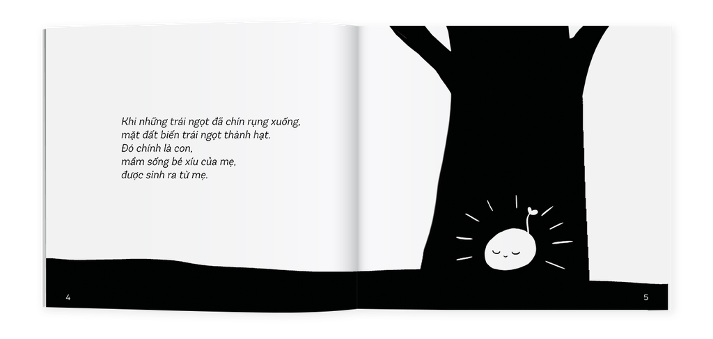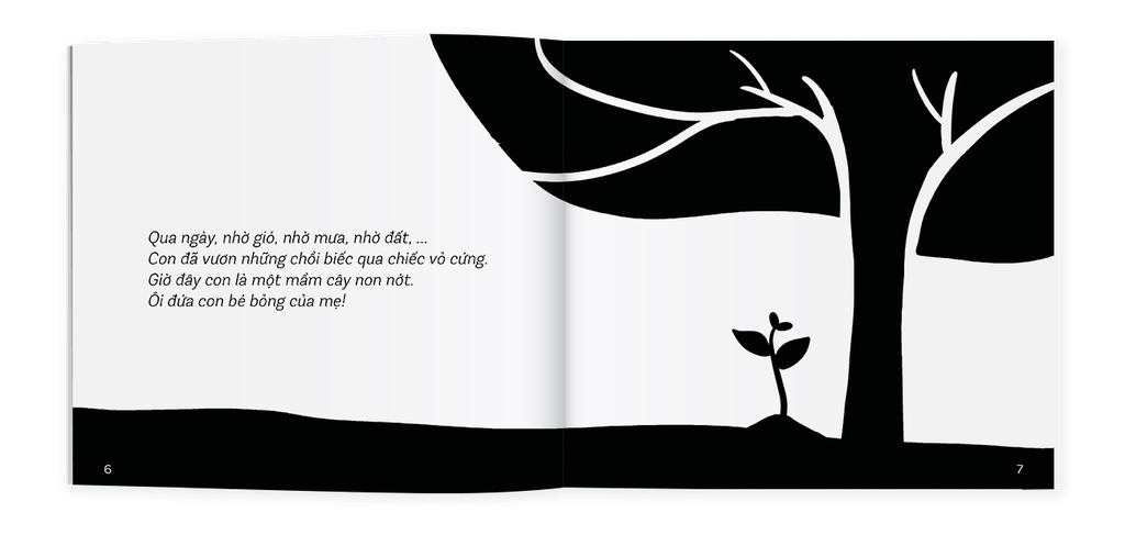 Hạt mầm của mẹ: Quả ngọt rơi xuống đất rồi trở thành hạt. Hạt nở thành mầm, thành cây nhỏ. Trải qua năm tháng cùng bao khó khăn, thách thức của nắng, mưa, gió, bão,... cuối cùng trở thành một cây lớn trưởng thành bên cạnh cây mẹ. Khi cây con ra đợt hoa trái đầu tiên cũng là lúc cây mẹ đã già đi, trơ trọi lá với mong mỏi con mình có thể ra thật nhiều trái ngọt.